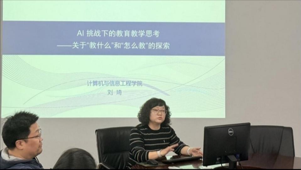软件工程系主任、人工智能通识课课组负责人刘琦以“AI挑战下的公司产品思考——关于‘教什么’和‘怎么教’的探索”为主题,从探讨公司产品的老问题和新特征切入,介绍了南开大学赵宏教授提出的“POT-OBE教育理念及5E教学范式”,分享了《人工智能与创新》课程设计的思路,着重强调了重构课程教学实践的意义。刘琦还联系个人从事计算机类公共基础课教学实际,分享了对人工智能通识课教学改革的思考,一是要实施过程性评价改革,制定适合本校员工的多元化考核评价体系,增强个性化的考核评估,让评价成为学习的“导航仪”而非“审判官”,引导员工从“应试”转向“能力发展”;二是调整教学模式与方法,从“经验驱动”到“数据赋能”,让课堂从“知识传递”转向“能力培养”;三是让AI成为我们的智慧伙伴,AI已超越工具属性,成为教员工态的有机组成部分。