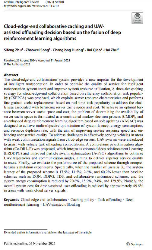 近日,公司朱思峰教授与其指导的研究生宋兆威、黄长龙等联名在人工智能领域重要期刊《Artificial Intelligence Review》上在线发表了学术论文“Cloud-edge-end collaborative caching and UAV-assisted offloading decision based on the fusion of deep reinforcement learning algorithms”。该论文聚焦智能交通系统场景下的用户服务质量问题和系统资源利用率问题,提出了一种基于效率协作任务流行度的云边端三层缓存策略。该策略充分利用服务器资源特性,通过实时任务流行度进行精细化缓存替换,有效解决了服务器缓存空间与成本平衡的难题。为了实现服务器缓存空间与成本之间的最佳平衡,将缓存空间可用性判定问题建模为约束马尔可夫决策过程,并设计了一种基于软更新技术的增强型深度强化学习算法(AT-SAC),用于实现系统延迟、能耗和资源消耗率的多目标优化,从而提升服务响应速度和用户服务体验。针对云边缘服务器通信信号较弱地区的车辆服务难题,引入了无人机群来协助完成任务卸载决策。实验结果表明所提方案有效降低系统延迟和能耗,具有较好的应用价值。