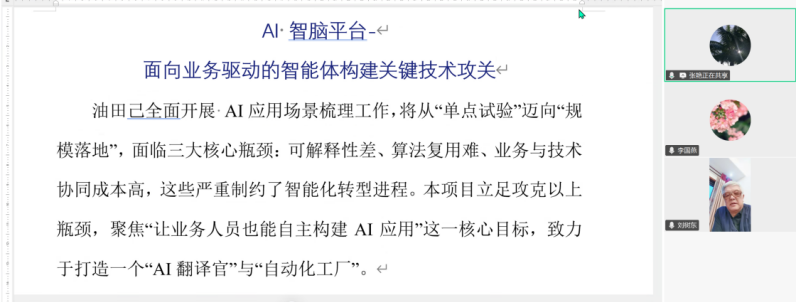 本次研讨聚焦于数智技术赋能传统产业升级的核心挑战,旨在打通“需求→数据→模型→应用”的端到端智能流水线,实现AI开发从“定制开发”到“需求驱动”的范式跃迁。同时,为油田数智化转型提供核心技术支撑,助力油气生产等领域的AI应用从“单点试验”向“规模落地”迈进。项目组致力于攻克关键技术壁垒,为产业智能化升级提供坚实的技术基础。