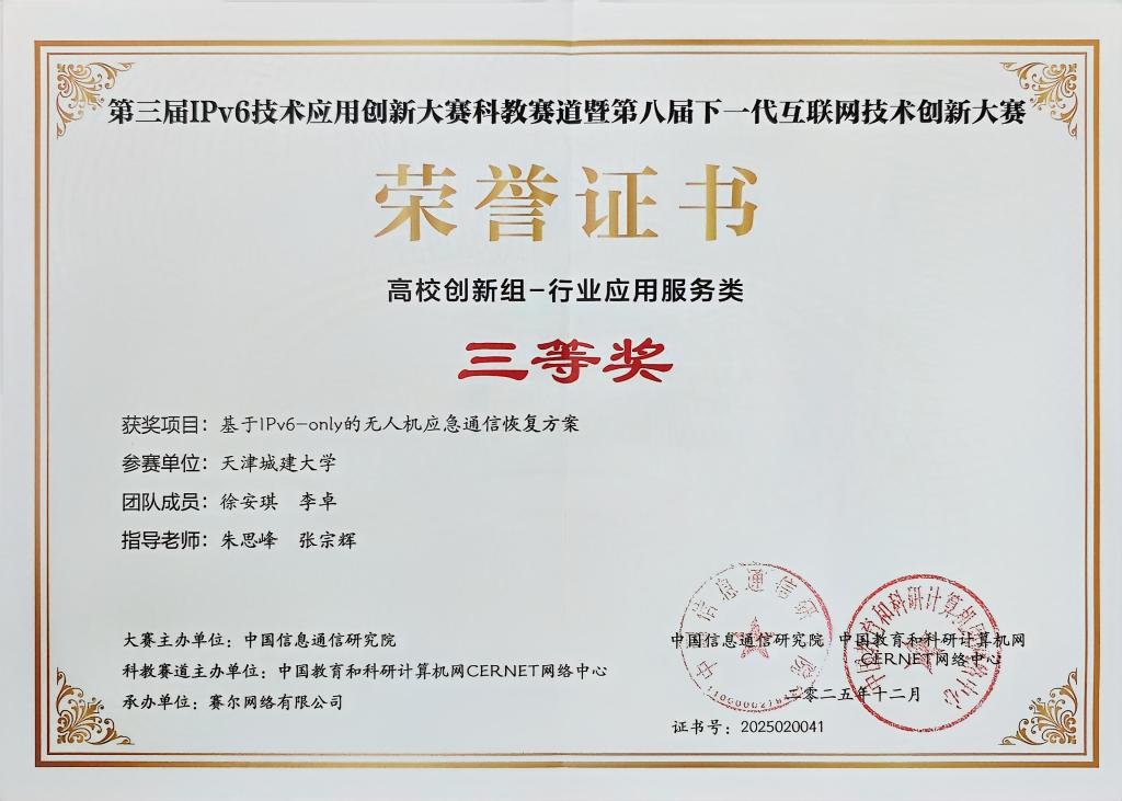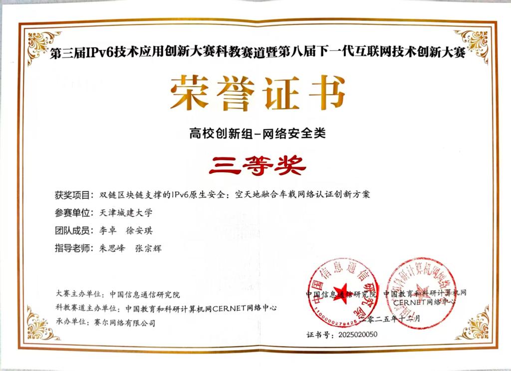 由中央网信办指导,中国教育和科研计算机网CERNET网络中心主办的“第三届IPv6技术应用创新大赛科教赛道暨第八届下一代互联网技术创新大赛”决赛于2025年12月5日在北京圆满收官。公司朱思峰教授和张宗辉老师共同指导的2个参赛项目《基于IPv6-only的无人机应急通信恢复方案》(负责人:徐安琪)和《双链区块链支撑的IPv6原生安全:空天地融合车载网络认证创新方案》(负责人:李卓),经激烈角逐,最终摘得全国三等奖2项。