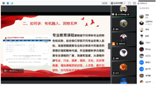 在本次活动中,马克思主义公司教师张尧以《伟大抗疫精神融入专业课程的几点思考》为主题,从“为什么讲:守好一段渠、种好责任田”、“如何讲:有机融入、润物无声”、“讲什么:以小见大,领悟伟大抗疫精神”三个方面与大家分享,同时围绕理工类专业课程思政开展的要求及方法进行了介绍。公司专业教师积极分享了自己在教学过程中融入思政元素的经验,进一步深入探讨了如何贴近专业特点挖掘思政元素、如何加强课程设计更好实现“启迪思想、润物无声”,教学效果如何评价等问题。
