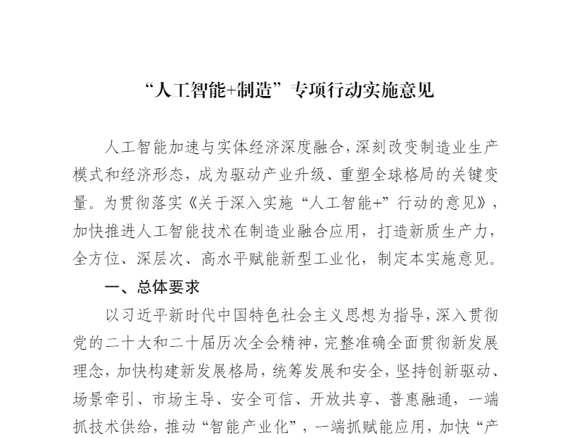 工业和信息化部 中央网信办 国家发展改革委 教育部 商务部 国务院国资委 市场监管总局 国家数据局关于印发《“人工智能+制造”专项行动实施意见》的通知